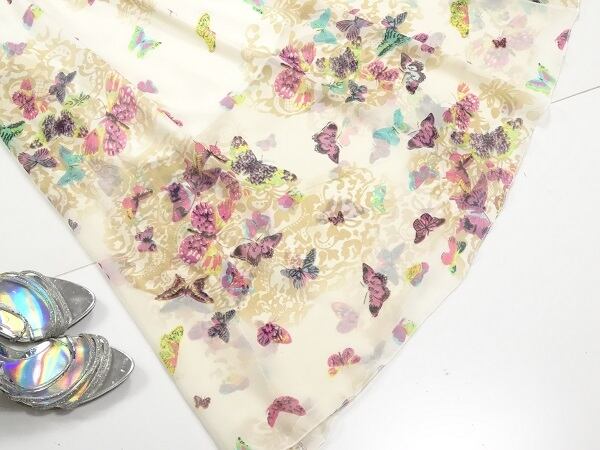 かろやかな生地と派手すぎないお洒落柄の蝶々花柄マキシ丈ノ-スリ-ブワンピ-スです。裏地あり。ファスナ-なし(かぶるタイプ)。