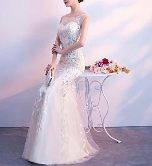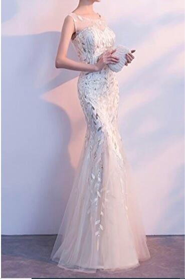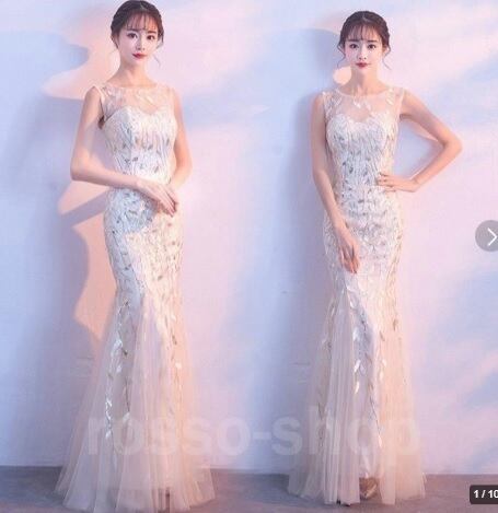 チュールのマーメイドドレス。サテン地に鮮やかな金の小さなスパンコールをつなげた刺繍が施されたチュ-ルを重ねた豪華なデザイン。くびれたウエストがセクシーさを醸し出しています。パーティやライブ、イベントなど華やかなシーンに。デザイン上伸縮性はそれほどなく体のラインにフィットしたシルエットです。背中ファスナー有。裏地なし。胸パット有。