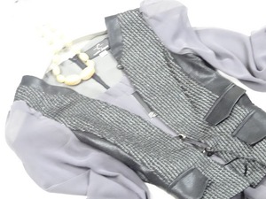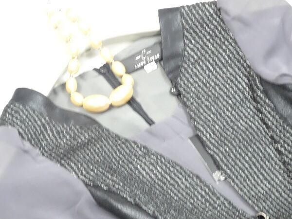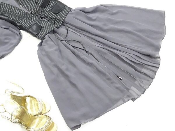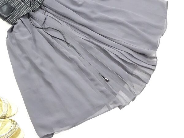 ラメ刺繍飾りのジレ仕立てのワンピース。トップス部分は、黒の合否にラメ糸刺繍。スカート部分は落ち着いたグレーのシフォンをたっぷり使用したフェミニンなデザイン。ユニークで上品な女性を表現してくれています。パーティやイベント、コンサート、結婚式にと、さまざまシーンで活躍してくれる美しい一着。背中ファスナー。裏地付。