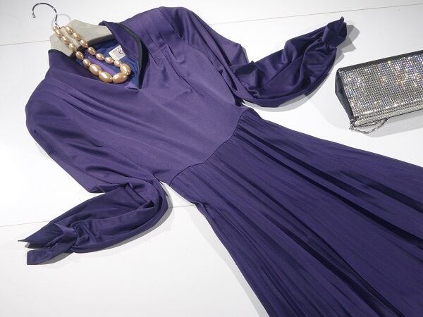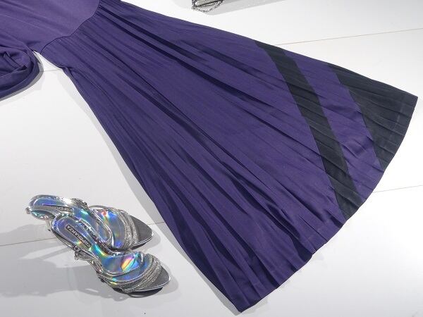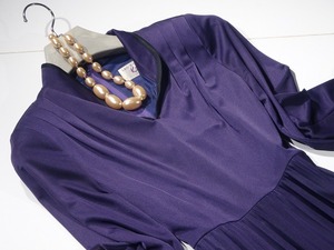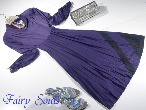 とろみ大人紫のアコーディオンプリーツロング丈のワンピース。襟は立て襟で黒のパイピングがアクセントに。とろっとした柔らかな生地をふんだんに使用したフェミニンなデザイン。ウエスト切替でスカート部分はプリーツ仕様になっています。上品で高貴な女性を表現してくれています。パーティやイベント、コンサート、結婚式にと、さまざまシーンで活躍してくれる美しい一着。背中ファスナー。裏地付。