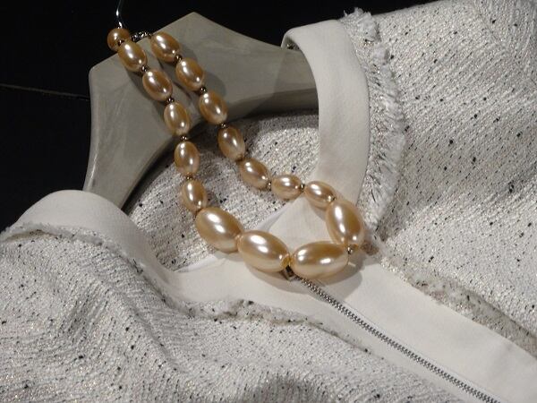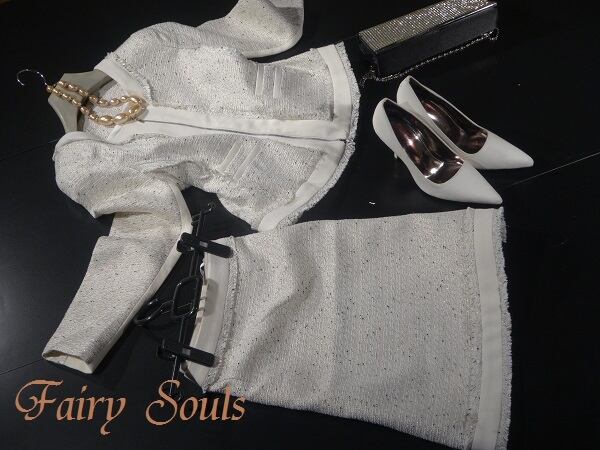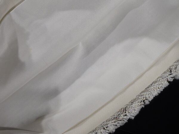 白のパイピングがアクセントのツイードのスーツ。ジャケットは、前身ごろ中央ファスナーで着やすさ抜群。スカートはウエストに白のパイピングを施したすっきりとしたタイトタイプ。上品でフェミニンなデザインです。パーティやイベント、コンサート、結婚式にと、さまざまシーンで活躍してくれる美しい一着。スカートはサイドファスナー。裏地付。