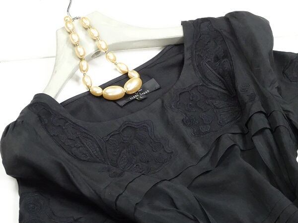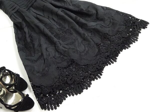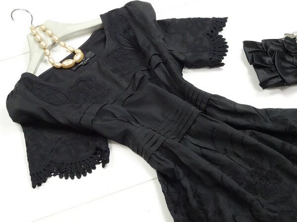 花刺繍と花レースのエレガントなワンピース。黒地に黒糸で花柄を刺繍。袖先と裾は立体刺繍の花柄カット。胸元とウエストにとられたタックも品がよく、パーティやイベント、コンサート、結婚式にと、さまざまシーンで活躍してくれる美しい一着です。左脇下ファスナー。裏地付。