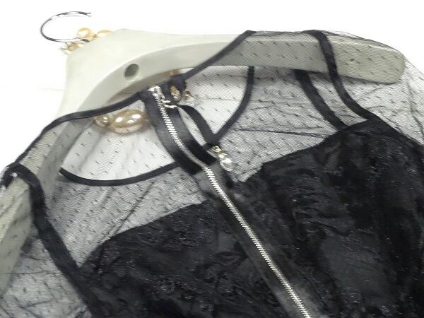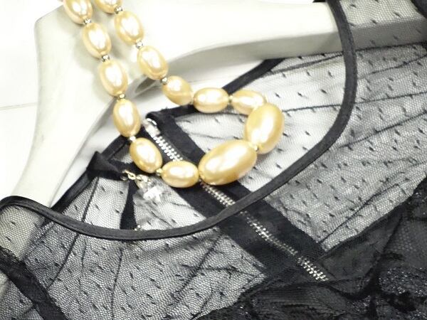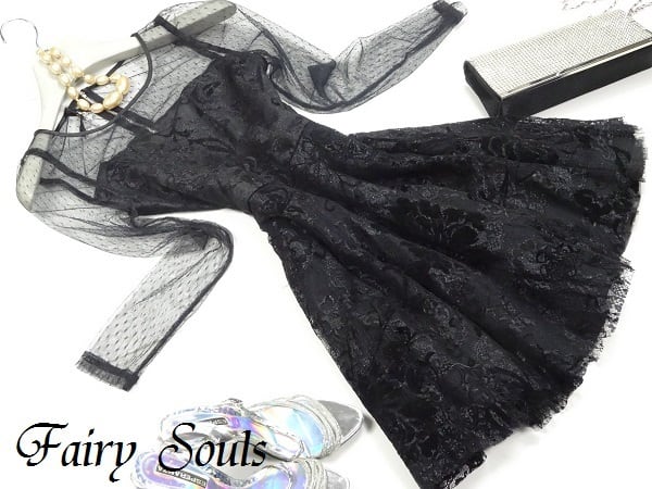ラメ入りレースチュール黒のドレスワンピース。花刺繍の生地の上に楕円のドット柄をあしらったネットチュールをかぶせた大変豪華でフェミニンなデザイン。エレガントで上品な女性を表現してくれています。パーティやイベント、コンサート、結婚式にと、さまざまシーンで活躍してくれる美しい一着。背中ファスナー。裏地付。