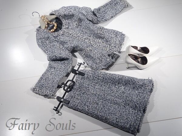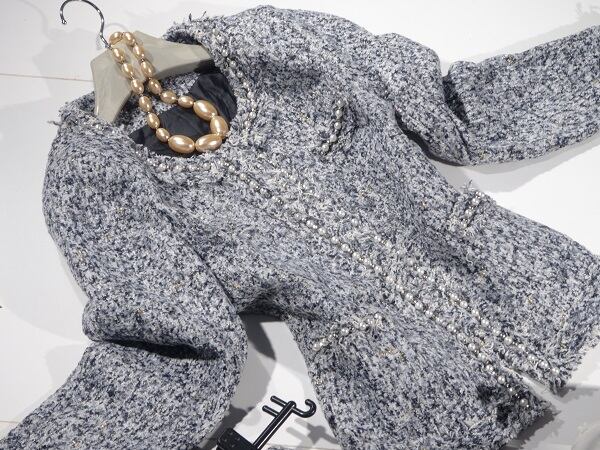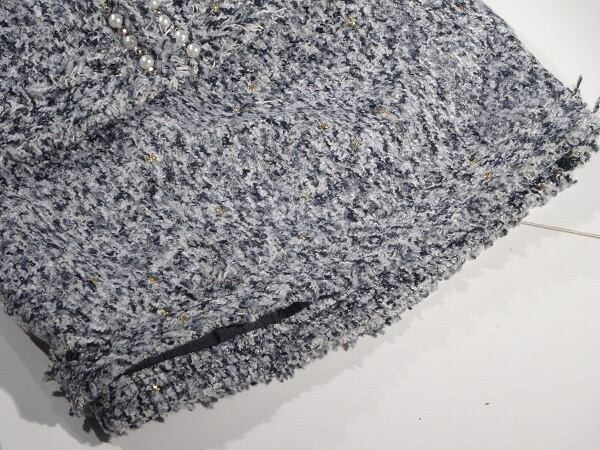 フェイクパール飾りのニットツイードのスーツ。ジャケットは、前身ごろ中央フック留めで着やすさ抜群。中央縦のラインと、ボタンのヘリ、袖先にフェイクパールとビーズ飾りをあしらいアクセントに。スカートはすっきりとしたタイトタイプ。上品でフェミニンなデザインです。パーティやイベント、コンサート、結婚式にと、さまざまシーンで活躍してくれる美しい一着。スカートはサイドファスナー。裏地付。