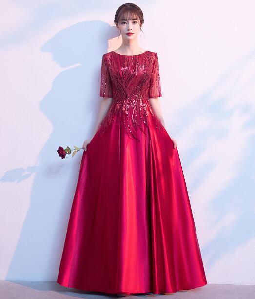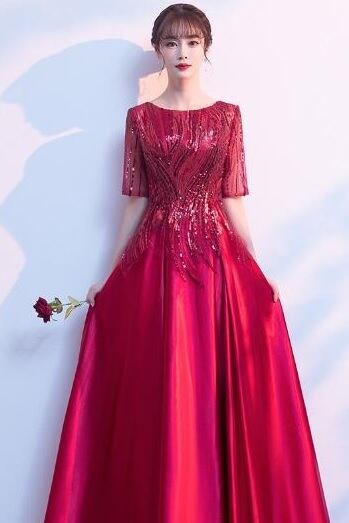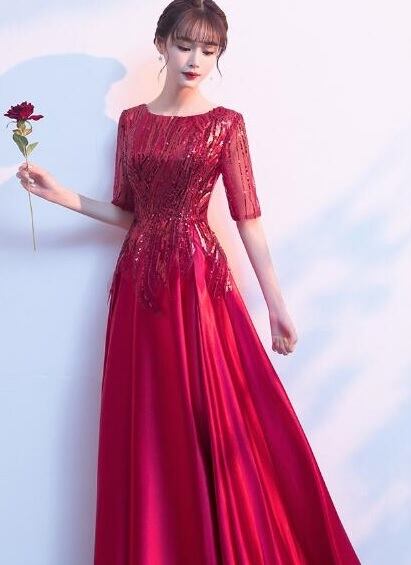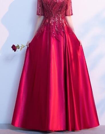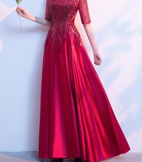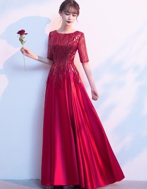 チュールとスパンコールのロングドレス。上半身は、ワインレッドのサテン地の上に赤のスパンコールを赤糸で留めた同色のネットチュールをかぶせ、華やかな仕様になっています。スカート部分はワインレッドのサテン地をふんだんに使用しボリューム感を演出。パーティやライブ、イベントなど華やかなシーンに目を引く一着です。背中ファスナー有。
