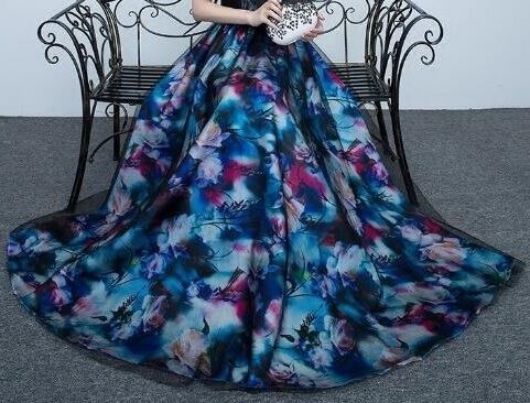 ネットチュールのパーティロングドレス。鮮やかな色味の花模様がプリントされた光沢のあるしっかりとした生地上に、上半身は黒のレース、ウエストから裾までは黒のネットチュールをかぶせた、華やかでいて、シックで上品なデザイン。1枚仕立てのチュール地をふんだんに使用し、流れるようなデザインがとても綺麗なスタイルを醸し出してくれています。全体的に優しい感じに仕上げられています。背中は編み紐掛。腰下ファスナ-有。裏地なし。胸パッド付。