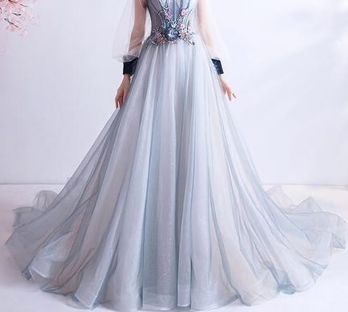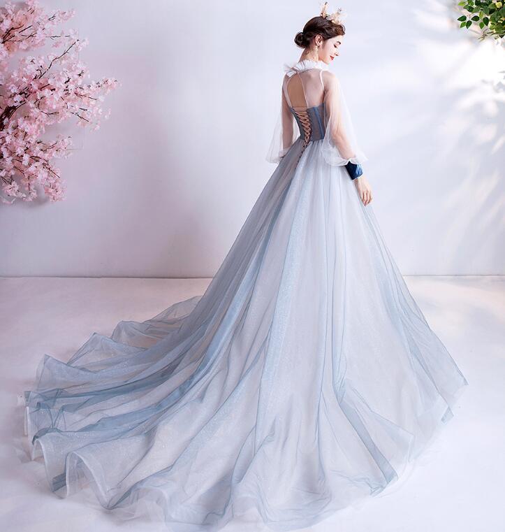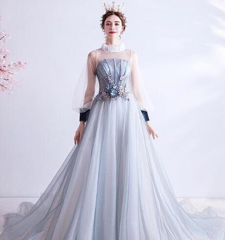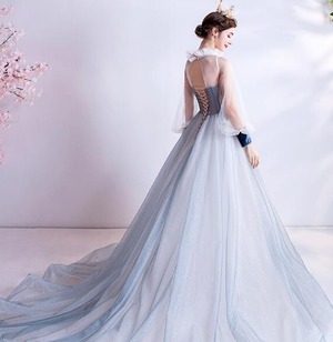 豪華なチュールロング丈パ-ティ-ドレス。サテン地の上にチュールをかぶせたエレガントなデザインです。袖はチュ-ル仕様になっていて透け感がエレガントです。胸元は立体刺繍が施されエレガントで大人の魅力をアップ。後ろの裾が長い引きずるデザインです。前撮り撮影やパーティやイベント、結婚式など、様々なシーンで、気品のある印象を与えてくれる一枚です。背中網掛けですので紐の結び具合により多少サイズ調整も可能です。背中結び紐有り。胸パット付。裏地有。