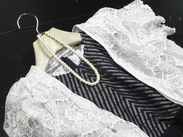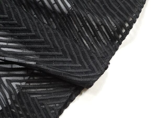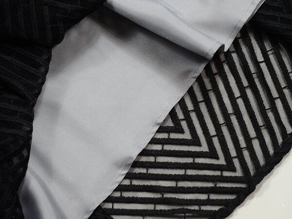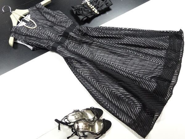 ボレロ付きチュールのワンピース。黒のネットチュールの上に斜めに黒の刺繍のストライプをあしらったノースリーブワンピースの上に、グレーカラーのレースのボレロを合わせたキュートなデザイン。ワンピースとボレロを別々にコーディネートしても楽しい一着です。パーティやイベント、コンサート、結婚式にと、さまざまシーンで活躍してくれます。(ワンピース)裏地付。背中ファスナー有。