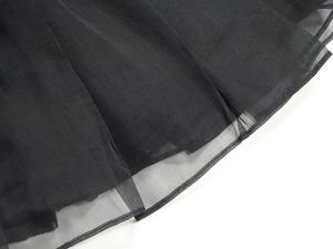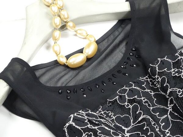 襟元ビジュー飾りネット刺繍のワンピース。襟元には黒のひし形ビジューをあしらいシックに。トップス部分は、ネットチュール地に白糸で花模様を刺繍。スカート部分はかろやかなオーガンジーをたっぷり使用し、豪華でフェミニンなデザイン。エレガントで上品な女性を表現してくれています。パーティやイベント、コンサート、結婚式にと、さまざまシーンで活躍してくれる美しい一着。左脇下ファスナー。裏地付。