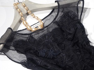 チュール地に花刺繍のワンピース。かろやかな黒のチュール地に黒糸で刺繍を施した豪華でフェミニンなデザイン。デコルテラインのほんのりとした透け感が上品な女性を表現してくれています。パーティやイベント、コンサート、結婚式にと、さまざまシーンで活躍してくれる美しい一着。左脇下ファスナー。裏地付。