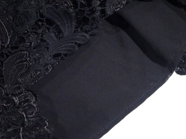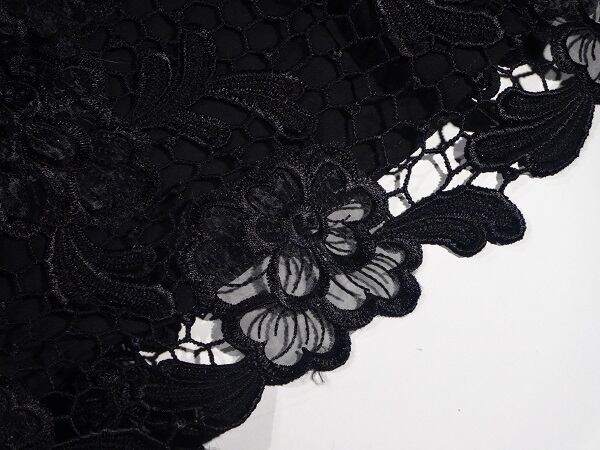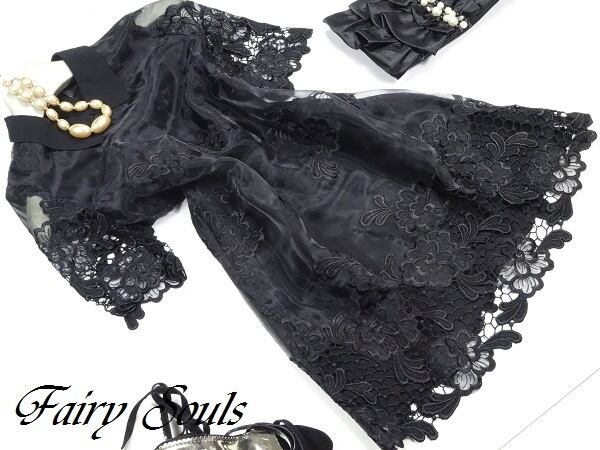 オーガンジーとパンチングレース刺繍のワンピース。繊細な花柄のパンチングレースとつややかなオーガンジーの組み合わせがみりょくてきでフェミニンなデザイン。レース模様に沿ってカットされた袖先と裾のラインが上品な女性を表現してくれています。パーティやイベント、コンサート、結婚式にと、さまざまシーンで活躍してくれる美しい一着。Sサイズ表示ですが、サイズにゆとりがあるので9号位まで可能。背中ファスナー。裏地付。