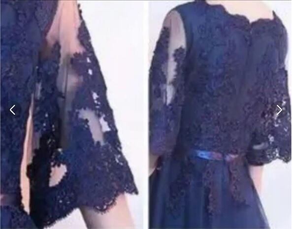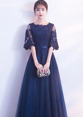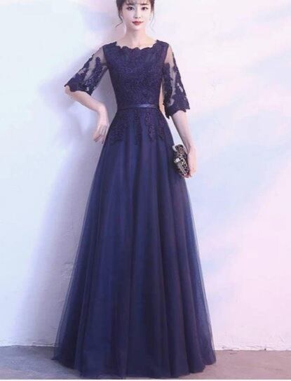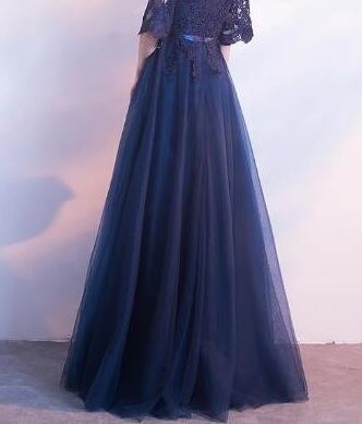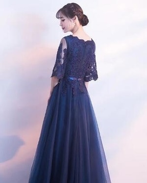 チュールロング丈パ-ティ-ドレスです。ネイビ-のサテン地に立体刺繍が施された同色のチュールをかぶせたエレガントなデザインです。袖の透け感がエレガントで大人の魅力をアップ。パーティやイベント、結婚式など、様々なシーンで、気品のある印象を与えてくれる一枚です。背中ファスナ-有。胸パット付。
