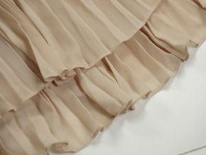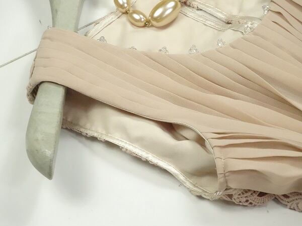 優雅さと気品を感じさせる総プリーツのワンピースです。ゆったりとしたプリーツが歩くたびにシルエットを美しく見せてくれます。サイドから後ろ身頃にかけてレ-ス編みで身頃中央はプリ-ツと素晴らしいデザインです。そんな上品さを醸し出してくれるデザインです。裏地あり。ファスナ-なし(かぶるタイプ)。