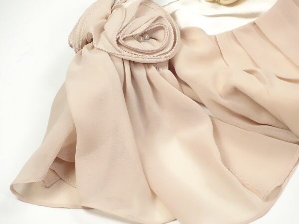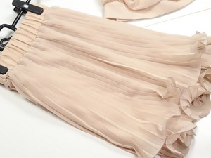 プリーツスカートとシフォンブラウスのツーピース。ブラウスはやわらかなシフォンをたっぷり使用し、肩の薔薇のモチーフがキュートな印象に。スカートはウエスト総ゴムで着やすさ抜群。たっぷりとしたプリーツが品の良いフェミニンなデザインになっています。パーティやイベント、コンサート、結婚式にと、さまざまシーンで活躍してくれる美しい一着。ブラウスの方のモチーフは取り外し可能。ブラウスはファスナーなしのかぶるタイプ。スカートウエストは総ゴム。裏地付。
