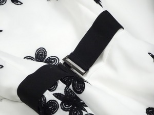 胸元透け感花刺繍のシックなワンピース。やわらかな白地に手書き風ポップな花模様を黒の糸で刺繍しています。シックな色合いに、袖先のフリルがキュートさをプラス。ウエストの黒のベルトがアクセントになっています。デート、お呼ばれ、パーティ、コンサート、結婚式にと、さまざまなシーンに活躍してくれます。ベルト付き。脇下ファスナー。裏地あり。