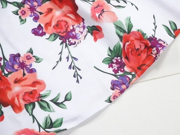 ベルト付きゆったりフレア花柄プリントのワンピース。ゆるやかなラウンドネックにゆったり広がったフレアライン。つややかな白地にポップな花模様をプリント。キュートでエレガントな印象に。パーティやイベント、コンサート、結婚式にと、さまざまシーンで活躍してくれる美しい一着。背中ファスナー。裏地付。