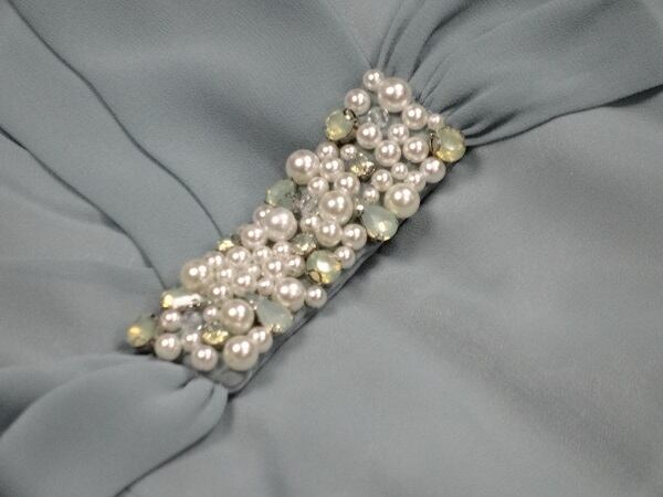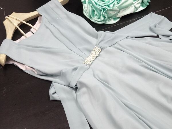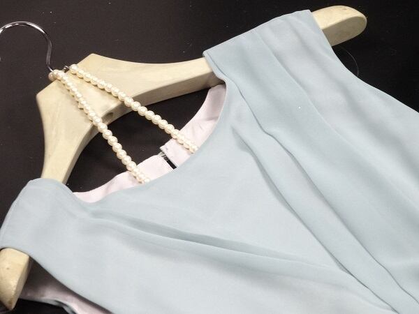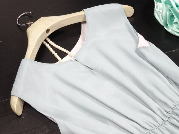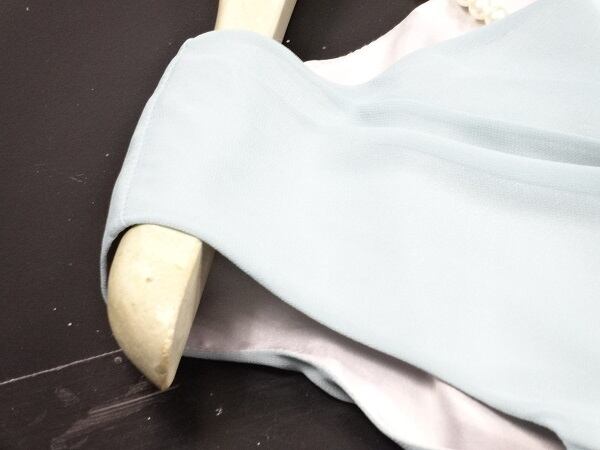 ふんわりフィッシュテールのワンピース。しなやかな浅黄色のシフォン地をたっぷりと使用し、前後で裾の長さを変えたフィッシュテール仕立て。胸元は両肩からウエスト中央にかけてタックをとりエレガントな印象をあたえています。共布のウエストリボンベルトがアクセントに。ウエスト背中側がゴム仕様になっているのでウエストサイズに伸縮性があります。裏地有。ファスナーなしのかぶるタイプ。ビジュー飾りのついた共布のウエストリボンベルト付。