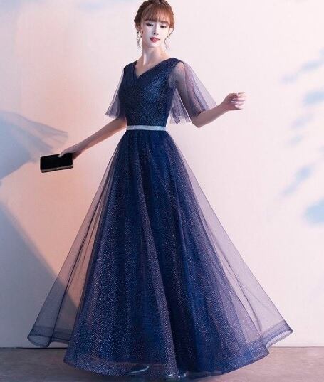 ドット柄チュ-ルパーティ-ロングドレスです。深いネイビーのチュール地に小さなドットを全体にあしらった豪華な印象のデザイン。背中はリボンの編み掛けになっています。裏地有。胸パット付き。