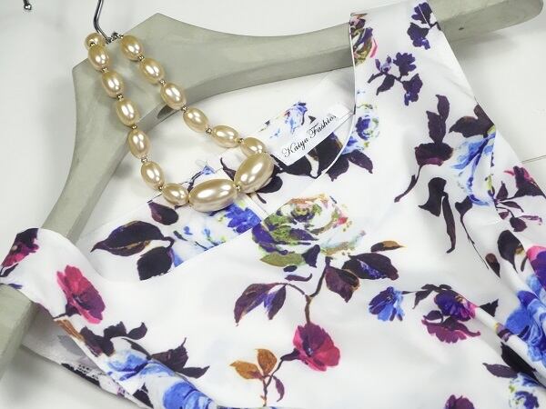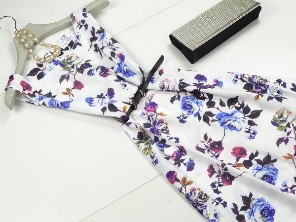 花模様ベルト付きフレアのワンピース。柔らかい生地にカラフルな花模様を大胆にプリント。上品な女性を表現してくれています。パーティやイベント、コンサート、結婚式にと、さまざまシーンで活躍してくれる美しい一着。黒の細ウエストベルト付き。背中ファスナー。裏地なし。