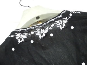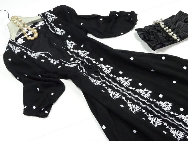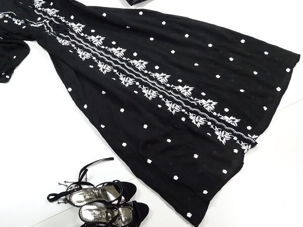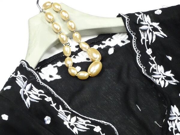 七分袖エスニックモダン刺繍のワンピース。ウエストは通しリボンを前で結びます。前合わせ胸元フック2つ留めなので、胸元が気になる方はインナー着用をお勧めします。立てにすっと伸びたボタニカル刺繍と、各所に散りばめられた小さな花の刺繍がエスニックな魅力を醸し出しています。ほんのりとした透け感が上品な女性を表現。ワンピースとしても、また下にパンツを組み合わせてロングチュニックとしても楽しんで頂けます。パーティやイベント、コンサート、結婚式にと、さまざまシーンで活躍してくれる美しい一着。ファスナーなしの前フック留め。ウエスト下スカート部分のみ裏地付。