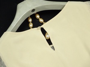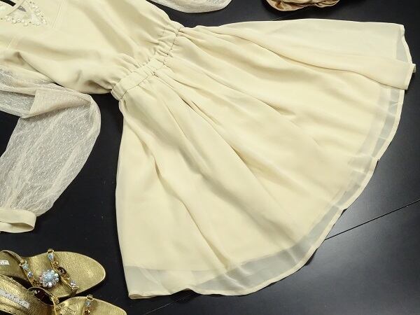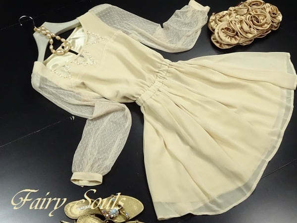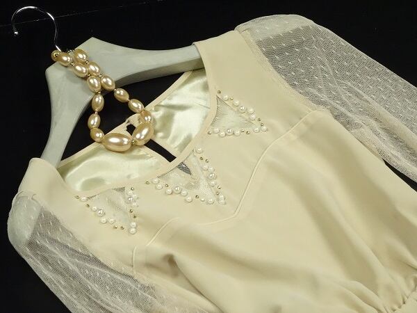 袖チュール胸元ビジュー飾りのワンピース。胸元は3か所三角にチュールを使用し、周りをフェイクパールやビーズを散りばめてアクセントに。袖はチュール仕様でほんのり透け感があり、フェミニンで上品な女性を表現してくれています。ウエストはゴム仕様で伸縮性あり。パーティやイベント、コンサート、結婚式にと、さまざまシーンで活躍してくれる美しい一着。ファスナーなしのかぶるタイプで、後ろ襟元ボタン1つ留め。裏地付。