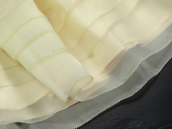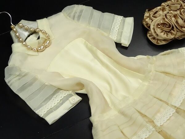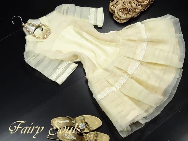 スカ-ト部分の繊細な刺繍がとてもエレガントかつオシャレで透明感のある素材使いが女性らしさをグ-ンと引き出してくれるワンピ-スです。コサ-ジュ付き。裏地あり。