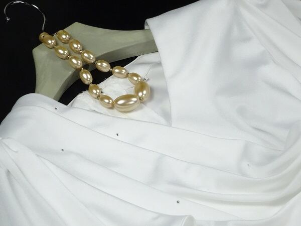 胸から腰までのドレ-プがとてもしなやかで大粒のラインスト-ンが散りばめられウエストには、飾りドレ-プととても綺麗でエレガントなロングドレスです。大人の女性を醸し出してくれる一着です。裏地あり。背中ファスナ-有。肩パッドあり。