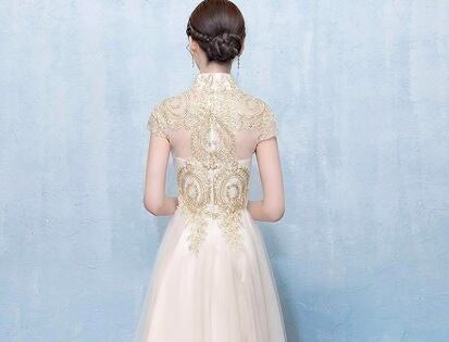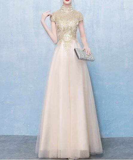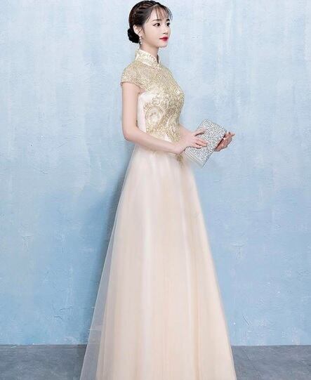 襟元チャイナ風金糸刺繍のロングドレス。上半身は柔らかなチュール地に金糸で刺繍を施し、下半身はサテンとチュールをたっぷりと重ねボリューム感を出している華やかで美しい一着です。胸元と背中の両サイドはチュールのみでほんのりと透けて見える肌が上品なセクシーさを醸し出しています。パーティやライブ、イベント、結婚式など、どんなシーンでも活躍してくれる一着です。背中ファスナー有。裏地有。胸パット付。