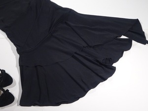 アンシンメトリーシックなフリルのドレスワンピース。生地は柔らかで伸縮性のあるジャージ素材。サイズに幅をもって着用いただけます。胸もとでリボン上に生地を結び、少ししぼったウエストからすそにかけてふんわりとフリルがアンシンメトリーに広がるフェミニンなデザインになっています。パーティやイベント、コンサート、結婚式にと、さまざまシーンで活躍してくれる美しい一着。肩紐調整不可。ファスナーなしのかぶるタイプ。裏地なし。