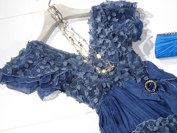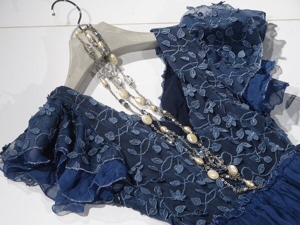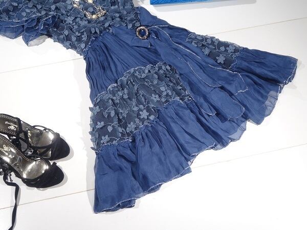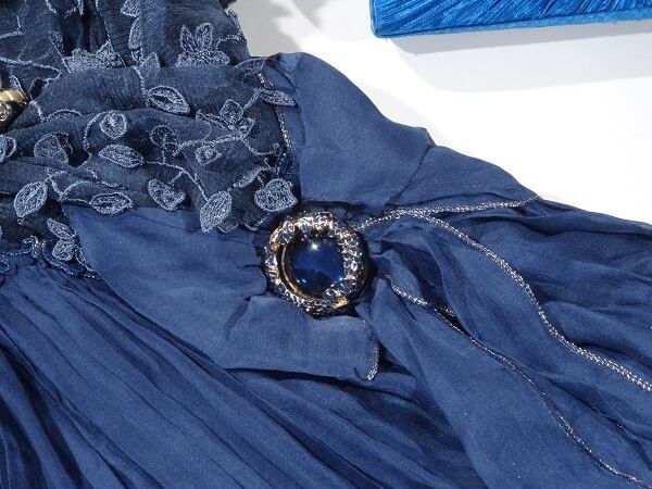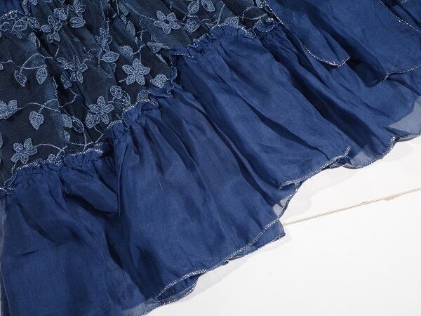 シフォンとチュール刺繍のワンピース。胸元は深いV字カット。トップス部分とスカートの裾部分にはチュール地に小花の立体刺繍をほどこし、袖はフリルを重ね、ウエストから裾にかけてシフォンをたっぷり使用したシャーリング仕様。豪華でフェミニンなデザインになっています。ほんのりとした透け感が上品な女性を表現してくれています。パーティやイベント、コンサート、結婚式にと、さまざまシーンで活躍してくれる美しい一着。左脇下ファスナー。裏地付。