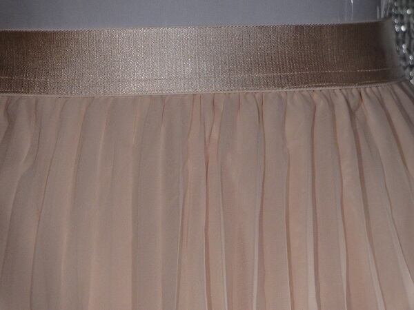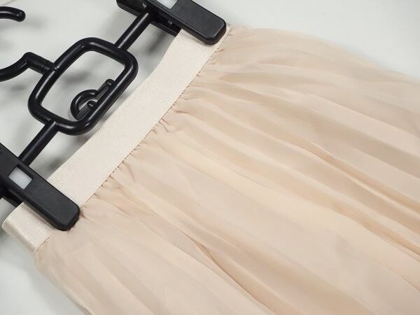 シフォンベビーピンクミモレ丈のプリーツスカ-ト。しなやかでやわらかなシフォンの生地をたっぷり使用し女性らしさUP!。ウエストはゴム仕様でゆったりと着て頂けます。風に優しくなびき、歩くたびに着る人の足元を美しく見せてくれる一着です。ファスナーなし。裏地付。