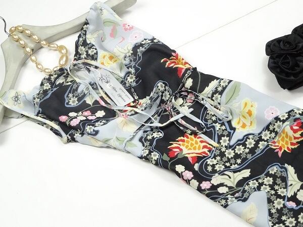 イタリア製和柄モダンなロング丈のワンピース。襟ぐりに共布の紐が通っていて、前中央で結ぶと、中央が楕円にくり抜いたような形になり、お洒落な印象です。全体に和風テイストな柄がプリントされていて、柄が多い割にはくどくなく、上品に仕上がり、しなやかな女性を表現してくれています。パーティやイベント、コンサート、結婚式にと、さまざまシーンで活躍してくれる美しい一着。伸縮性があります。ファスナーなしのかぶるタイプ。裏地付。