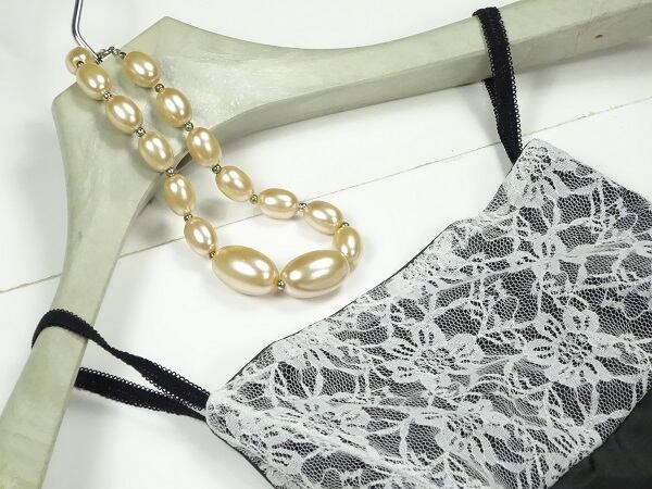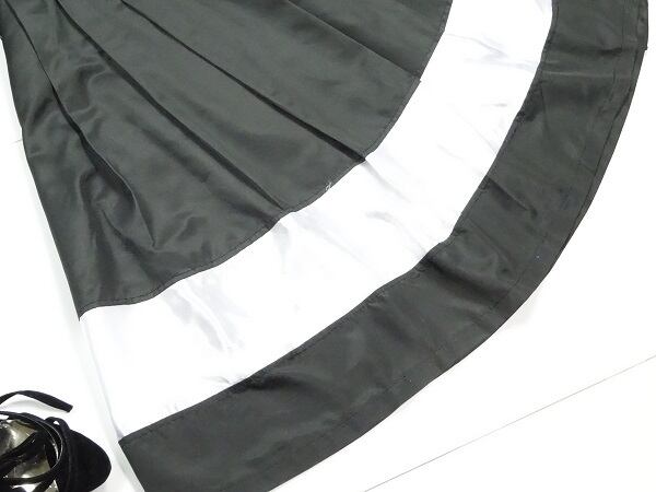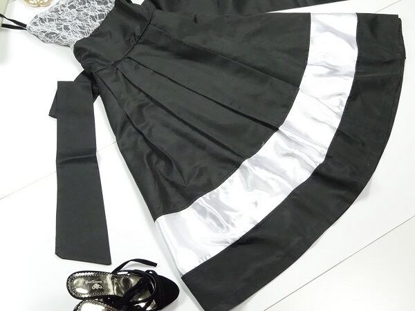 サテンとレース刺繍のドレスワンピース。トップス胸もと部分は、黒のサテン地の上に白のレース刺繍をあしらい、スカート部分のすそには白の幅広サテンのボーダーがアクセントに。ウエストは黒のサテンのリボンを結びキュートでフェミニンな印象に仕上げています。パーティやイベント、コンサート、結婚式にと、さまざまシーンで活躍してくれる美しい一着。リボンは縫い付け。肩紐調整不可。背中ファスナー。裏地付。