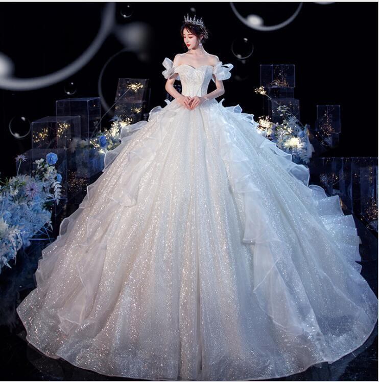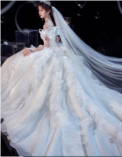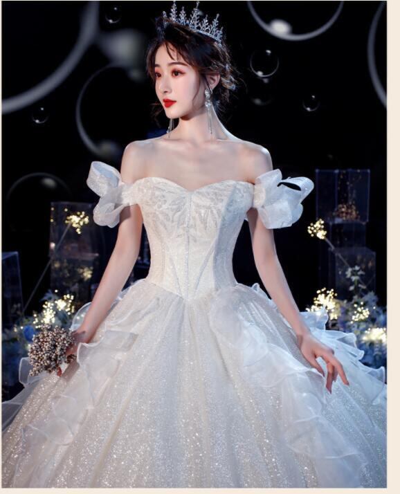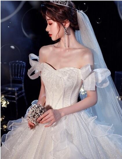 ネットチュールのウエディングドレス。トップス部分はハートカットされた胸元に銀のラメを花びら状にちりばめた様子が美しく上品な印象を与えています。オフショルダーの肩先からはしっかりとしたネットチュールが大きなリボンのようなラインを描き二の腕をしっかりカバー。ウエストからすそにかけては細かな銀のラメをふりかけ、サイドにはネットチュールのフリルをあしらい美しさを倍増しています。背中は腰まで編み紐掛け、腰から下はファスナーになtっているので着脱しやすくなっており、紐の締め具合でバストサイズが調整できます。パニエが付いているのでスカート部分にボリューム感が出せ、またデザイン性があり、豪華かつエレガントな雰囲気を醸し出しています。ウエディングドレスとしても、また、パーティやイベント、結婚式など、様々なシーンで、気品のある印象を与えてくれる一枚です。裏地あり(サテン地とチュールの2枚重ね)。背中腰下まで編み紐掛け。ファスナー有。胸パット付。