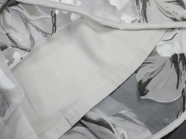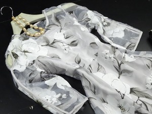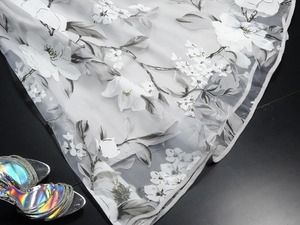 シックなオーガンジーのワンピース。落ち着いたグレーの地にモノトーンの花模様がバランスよくプリントされています。デコルテライン、袖のほんのり肌見せ透け感がエレガントで魅力的な一着です。結婚式や謝恩会などに。背中ファスナー有。ベルト付。裏地あり。