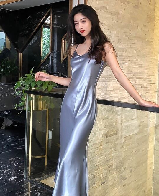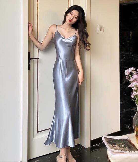 とろみ光沢のあるキャミワンピース。光沢のあるシックなシルバーグレーのサテン地を使用。軽く、体にフィットしたスリムな大人の女性を醸し出してくれる一着です。裏地なし。ファスナ-なしのかぶるタイプ。肩紐は長さ調整可。