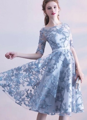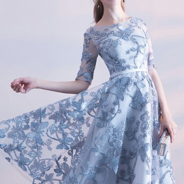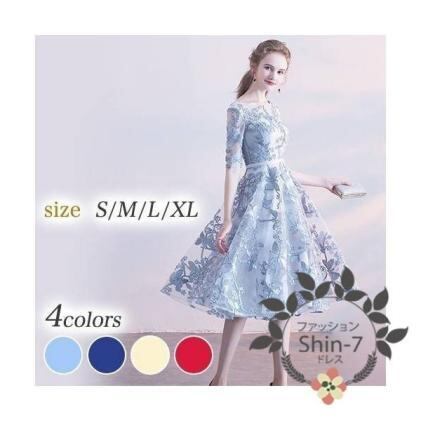 立体刺繍レースミディアムドレスです。全体に刺繍が施されたレ-スがサテン地に重ねられとても美しく豪華で大人の女性を醸し出してくれるエレガントなドレスです。デザイン性のあるスタイルがとても魅力的な一着です。全体的に優しい感じに仕上げられています。裏地なし。背中網掛け。背中腰より下ファスナ-有。胸パット付き。