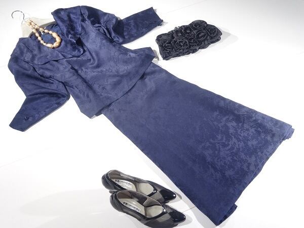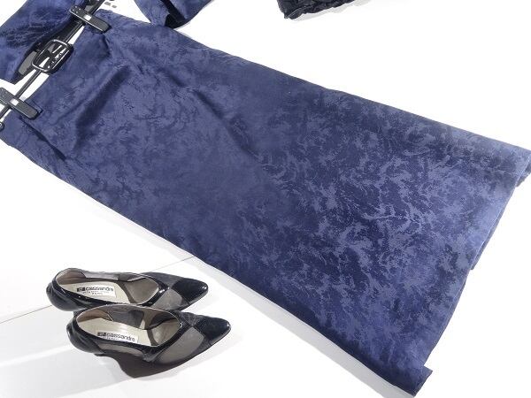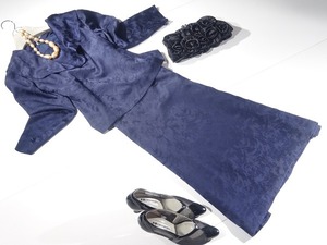 濃紺ロングスカートとブラウスのスーツ。ブラウスは、大きな丸襟がやさしい印象。スカートはシンプルラインのロング丈。とろみ感のあるつややかな生地に抽象的な柄をプリント。落ち着いた色合いで、上品な女性を表現してくれています。パーティやイベント、コンサート、結婚式にと、さまざまシーンで活躍してくれる美しい一着。ブラウスは背中ファスナー。スカートはサイドファスナー。裏地付。