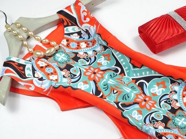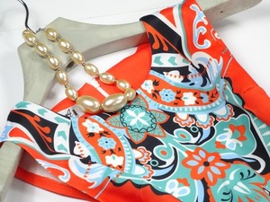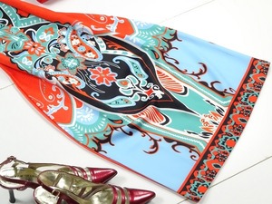 エスニック模様Aラインのワンピース。前面にエスニック調のカラフルな模様がプリントされ華やかな印象に。裏は赤に近いオレンジ一色。ジャージー素材で伸縮性があり、裏地なしで軽く体にフィットし、体のラインを美しく見せてくれます。気になる方はインナー着用をお勧めします。さまざまシーンで活躍してくれる美しい一着。背中ファスナー。裏地なし。