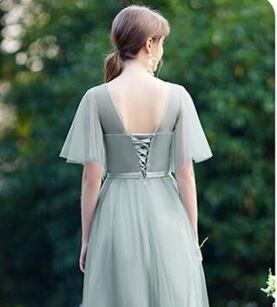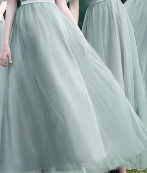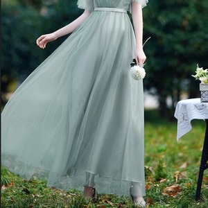 チュールロング丈パーティードレス。シルバ-サテン地の上にシックな灰青のチュールをかぶせています。胸元はバストの上でフリルをとり、ウエストにかけて中央にタックをとった華やかなデザイン。背中は腰まで編み紐掛けになっているので、編み紐の締め具合でバストサイズを調整いただけます。袖は肩から袖先にかけて広がったネットチュールを使用。フェミニンでかつエレガントな雰囲気に。パーティやイベント、結婚式など、様々なシーンで、気品のある印象を与えてくれる一枚です。裏地有。背中編み紐掛け。腰下ファスナ-有。胸パット付。