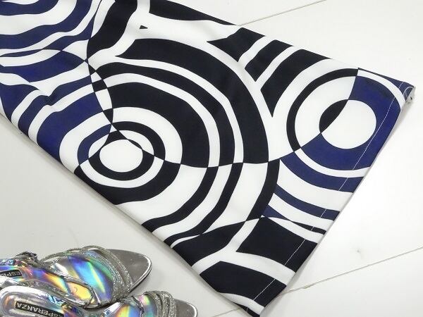 POPなうず模様がクールなワンピース。白地に紺と黒のうず模様が重なりユニークな印象を醸し出しています。柄に目がいき、体の線をカバーしてくれる嬉しいデザイン。背中側は柄のない白一色。裏地なしで軽く体の線を魅力的に見せてくれます。気になる方はインナー着用をお勧めします。POPで上品な女性を表現。パーティやイベント、コンサート、結婚式にと、さまざまシーンで活躍してくれる美しい一着。背中ファスナー。裏地なし。