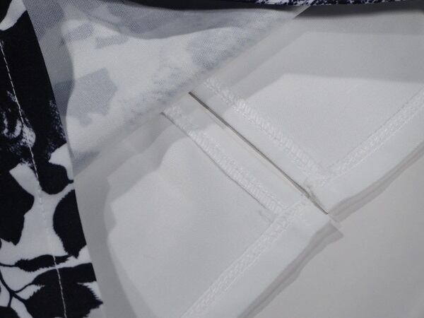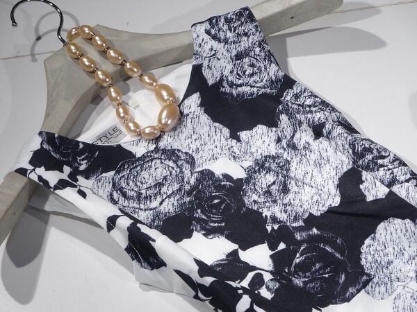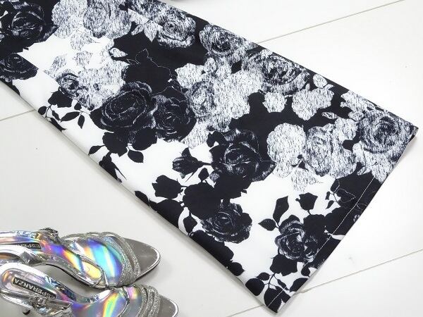 モノトーン花柄ノースリーブのワンピース。黒地に水墨画のような花柄がプリントされ、背中側は白一色。シックで上品な女性を表現。裏地なしで体の線を美しく見せてくれます。気になる方はインナー着用をお勧めします。パーティやイベント、コンサートにと、さまざまシーンで活躍してくれる美しい一着。背中ファスナー。裏地なし。
