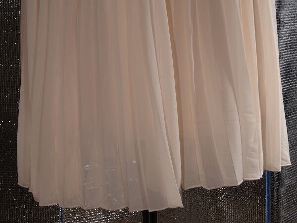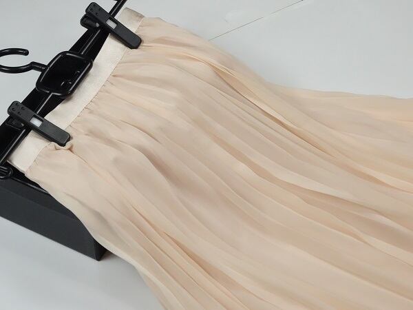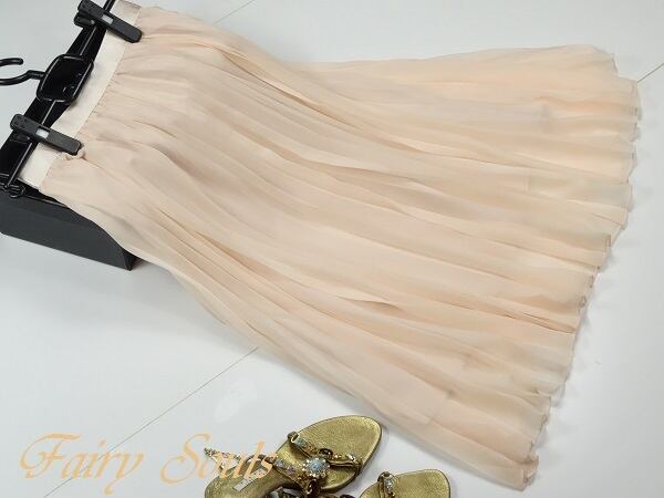シフォンベビーピンクミモレ丈のプリーツスカ-ト。しなやかでやわらかなシフォンの生地をたっぷり使用し女性らしさUP!。ウエストはゴム仕様でゆったりと着て頂けます。風に優しくなびき、歩くたびに着る人の足元を美しく見せてくれる一着です。ファスナーなし。裏地付。