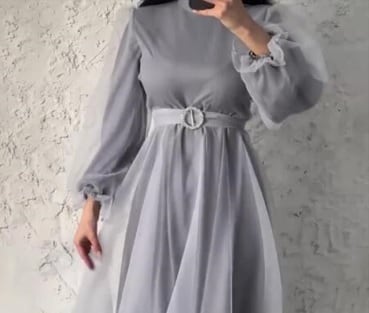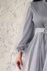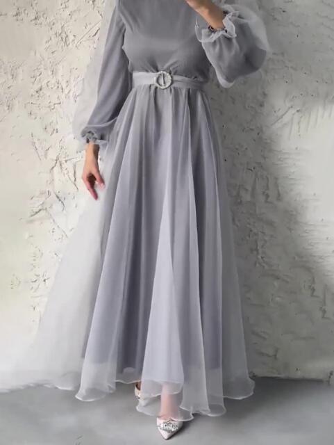 シックなオーガンジーのドレスです。落ち着いたグレーのオーガンジーを使用。ふんわりとした長袖は袖先をキュッとしぼめた可愛いデザイン。ウエストには共布のリボンをアクセントにあしらっています。エレガントで魅力的な一着。結婚式や謝恩会などに。背中ファスナー有。裏地あり。共布のウエストリボンは取り外し可能。