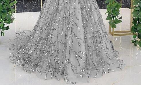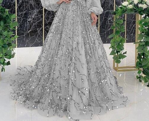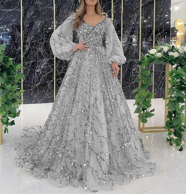 ラメ混チュール長袖のロングドレス。伸縮性のあるグレーのニット素材の裏地の上に、細かなシルバーのラメを川の流れのように配した同色のチュールをかぶせたボリューム感のある豪華なドレス。袖はたっぷりと生地を使用しふっくらとしたフォルムがエレガント。光の当たり具合で輝くラメが高級感を醸しだしてくれてます。パーティやライブ、イベント、結婚式など、どんなシーンでも活躍してくれる一着です。背中ファスナー有。裏地有。胸パッド付。