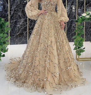 ラメ混チュール長袖のロングドレス。伸縮性のあるベージュのニット素材の裏地の上に、細かなシルバーのラメを川の流れのように配した同色のチュールをかぶせたボリューム感のある豪華なドレス。袖はたっぷりと生地を使用しふっくらとしたフォルムがエレガント。光の当たり具合で輝くラメが高級感を醸しだしてくれてます。パーティやライブ、イベント、結婚式など、どんなシーンでも活躍してくれる一着です。背中ファスナー有。裏地有。胸パッド付。