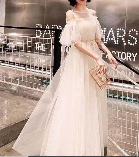 チュール肩見せロング丈のドレスす。白の下地に白のチュールをかぶせたエレガントなデザインです。袖は肩をみせて二の腕からフリル仕様になっています。胸元はチュールのみでデコルテラインを美しく見せてくれています。ウエストのフェイクパールがあしらわれたレースがアクセントになっていて、ピュアでエレガントな印象に。パーティやイベント、結婚式など、様々なシーンで、気品のある印象を与えてくれる一枚です。背中結び紐有り。背中腰から下ファスナ-有。胸パット付。