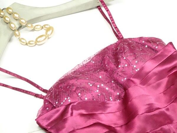 サテン光沢素材にチュ-ルを重ねたロングドレスです。胸元は星空のように輝くスパンが施されスカ-ト部分はティア-ドで流れるように広がり存在感があります。しなやかな生地でワイン色が、着る人の品の良さと大人っぽさを表現してくれています。背中シャ-リング。裏地あり。