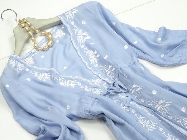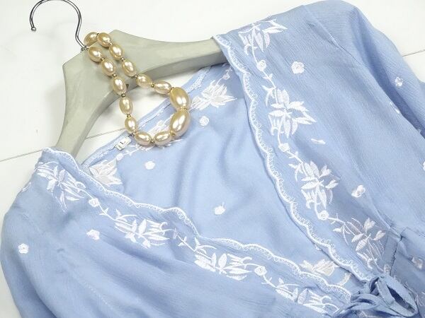 全体の刺繍が大人っぽくとても素敵です。シックでやさしくエレガントな一着です。ファスナーなし。裏地有。