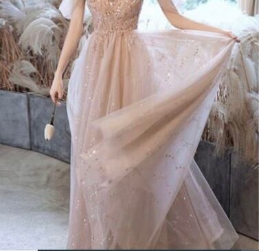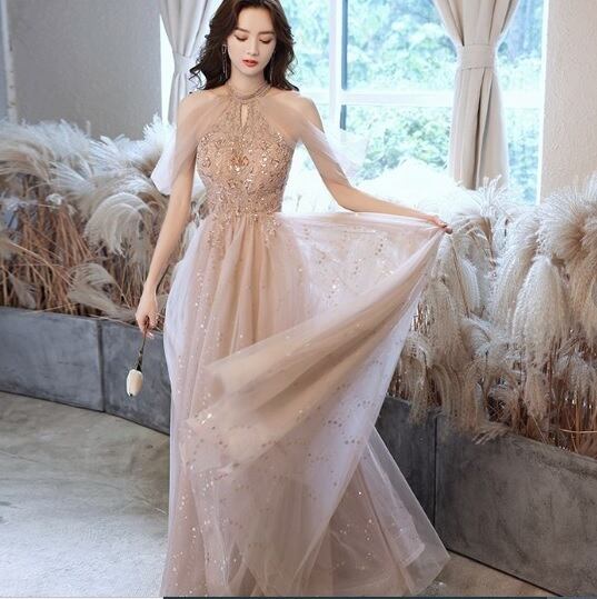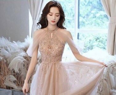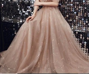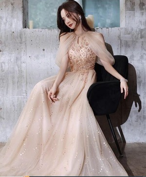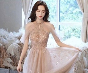 ホルダ-ネックチュールロングドレスです。ピンクのサテン地に同色のチュールを2枚かぶせ、トップス部分はビジュ-飾りが施されたエレガントなデザイン。全体的に星のビジュ-が施されています。パーティやイベント、結婚式など、様々なシーンで、気品のある印象を与えてくれる一枚です。背中ファスナ-有。胸パット付。